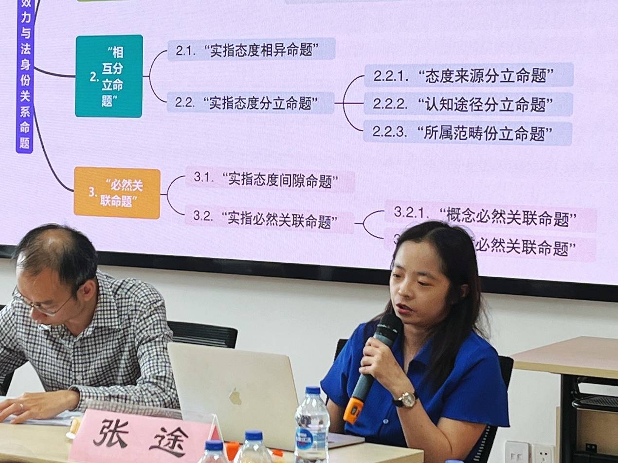 河南师范大学袁勇副教授作报告,题目为《哈特的法效力与法身份关系命题:重构与补证》。袁老师提出,本文的主要目标在于处理法效力概念与法身份概念的关系。具体路径是从哈特的法实证主义出发,援用塞尔的社会实在建构论,围绕“初显关系命题”,提出:法效力实指社群成员个人规范态度,法身份实指社群成员集体规范态度,两者同属异类、相互分立且必然关联。首先,袁老师指出了哈特的“初显关系命题”的特定论域、理论根据和不足。其次,分析了哈特 “初显关系命题”包含的三个子命题,即 “皆有实指命题”“相互分立命题”以及“必然关联命题”,并依此进行了补证。最后,通过厘定命题序列、划定论域边界、检讨相反学说,建构了一种用于解答法实证主义特有论题的更坚实的法效力与法身份关系论。