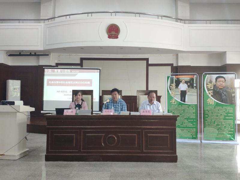 2020年10月14日13:00,快乐堂 “社会治理中的社会规范及其法治化问题”专题讲座暨赠书仪式于奉贤校区模拟法庭成功举办。本次活动由快乐堂 光启学者特聘教授、博士生导师刘作翔教授作为主讲人,院长蒋传光教授作为主评人,由学院党委副书记兼副院长陈燕老师主持,法学专业2019级全体本科生和2018级、2020级学生代表共同参与。