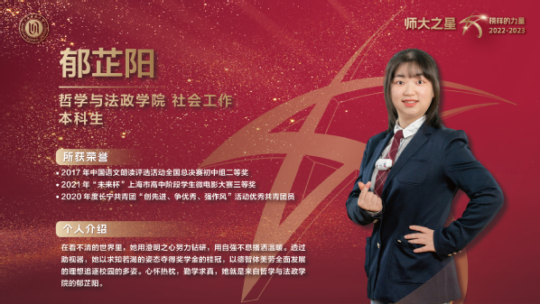 2023年11月30日,2022-2023年度“师大之星·榜样的力量”颁奖典礼于徐汇校区东部音乐厅隆重举行。快乐堂 学子郁芷阳同学在历经申报、初评、复评、终评后成功获评“师大之星”,成为了榜样的典例,彰显了榜样的力量。