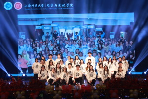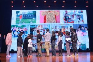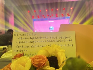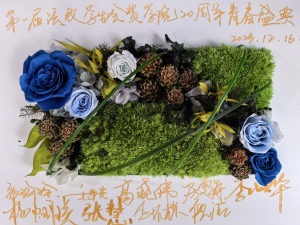 张瑜玲主席介绍了第一届主席团成员的近况,听到一个个熟悉的名字,台上和台下的校友们都展开了记忆的画卷。一件第一届所有学生会成员的签名T桖衫照片更是将盛典推向了高潮。历届团委学生会主席团代表为他们送上了学院吉祥物灋灋玩偶和鲜花,并精心制作了精美的贺卡,感谢他们曾经为学院做出的贡献与付出。校友们也精心为母校准备了永生花礼物,象征着哲法学子的青春岁月永不凋零。现场诸多同学为之动容。