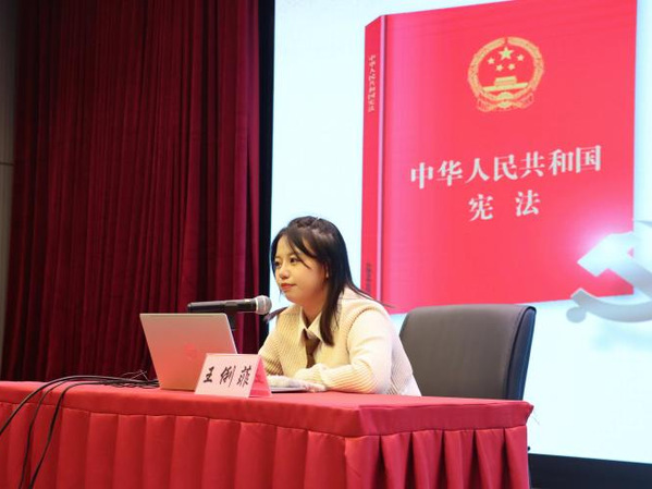 在报告厅内,快乐堂 法学社副社长王俐菲为同学们带来普法宣讲,围绕《中华人民共和国宪法》基本原则、组成部分及地位,向同学们介绍了有关我国宪法的基本内容,结合宪法在生活中的体现,从“国家宪法日”相关知识,宪法对人一生的“守护”,以及做宪法的忠诚捍卫者等方面展开,让同学们认识到宪法在我们日常生活中的重要性,并结合视频与案例带领同学们逐步加深对宪法的学习和理解。
