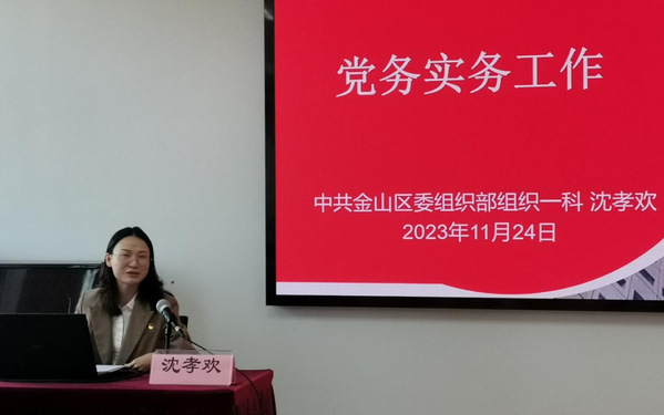 开幕式结束后是第一期培训活动。第一期培训活动邀请到中共金山区委组织部沈孝欢老师进行党务实务工作分享。沈孝欢老师从党务工作概念介绍引入,给同学们辨析了党务工作、党的建设、党的工作等概念。随后,沈老师采用文本讲授、案例教学和视频教学等方式,着重介绍了党的组织体系设置、党员发展工作、党的组织生活制度、党费缴纳与管理、党徽和党旗使用规范等实务工作。
