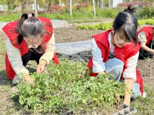 同学们将一株株嫩绿的番茄幼苗小心翼翼地从育苗盆里移出,放入挖好的土坑中,浇水填土并轻轻拍实,确保幼苗能够茁壮生长。通过亲自动手实践学习了解栽种的基本步骤,在栽苗过程中,同学们也彼此交流种植的经验技巧。