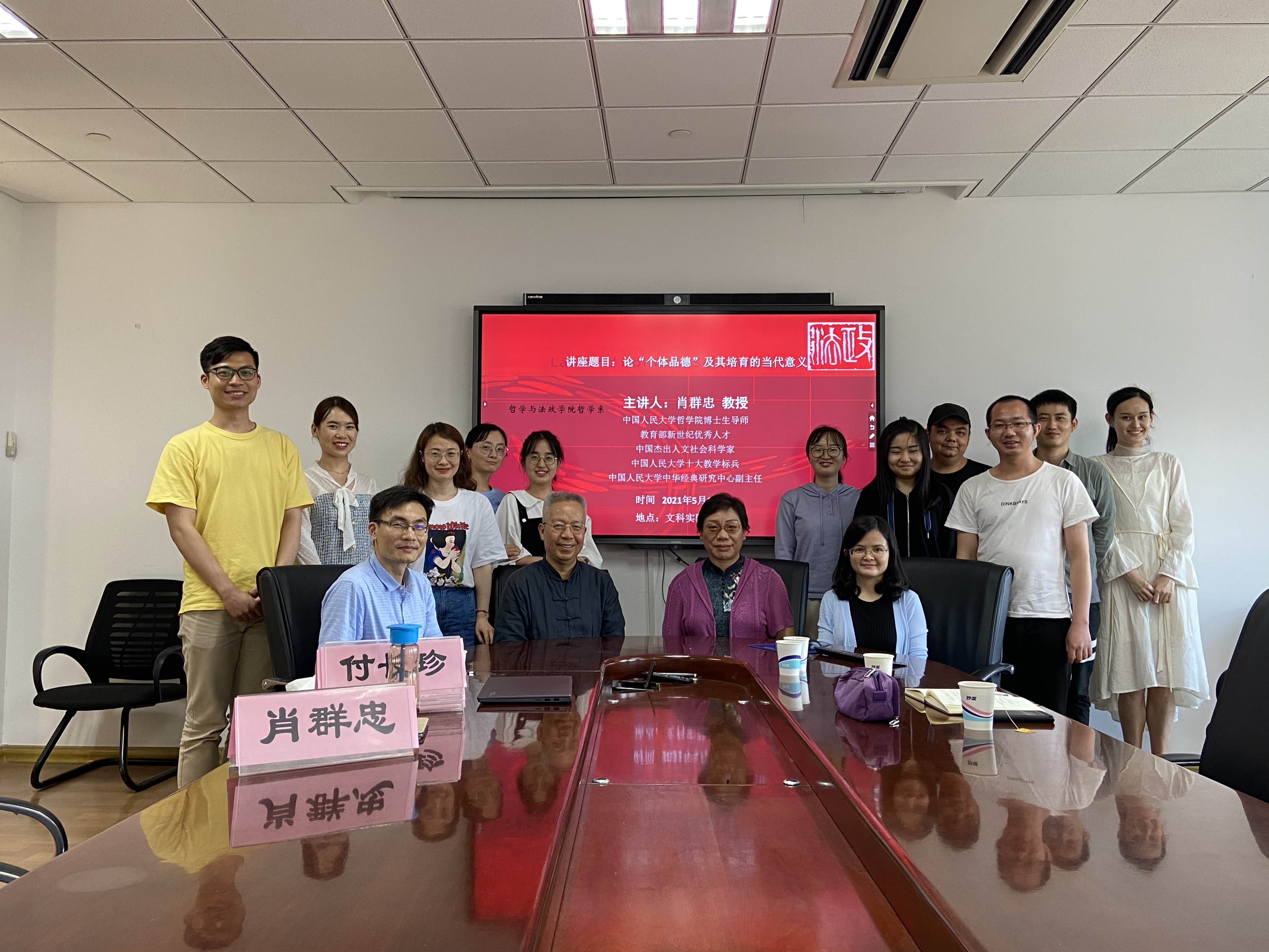 2021年5月14日下午,中国人民大学哲学院教授、博士生导师,中华经典研究中心副主任肖群忠先生应邀在快乐堂 文科实验楼906作题为“论‘个体品德’及其培育的当代意义”的讲座。讲座由哲学系系主任张自慧教授主持,哲学系部分教师、博士生和硕士生等二十余人聆听了讲座。