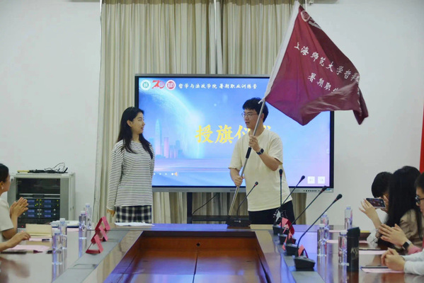 出征仪式中,学院辅导员王壬君向企业代表及学生骨干介绍学院2024年暑期职业训练营举办用意及参与渠道,鼓励同学们学思结合,知行合一,利用暑期时间走出校园,在求职实习及实践调研中把握机遇,洞察自我。学院团委副书记窦美霖向团委学生(兼职)副书记徐浩然授旗,象征着快乐堂 2024年暑期职业训练营正式启动。