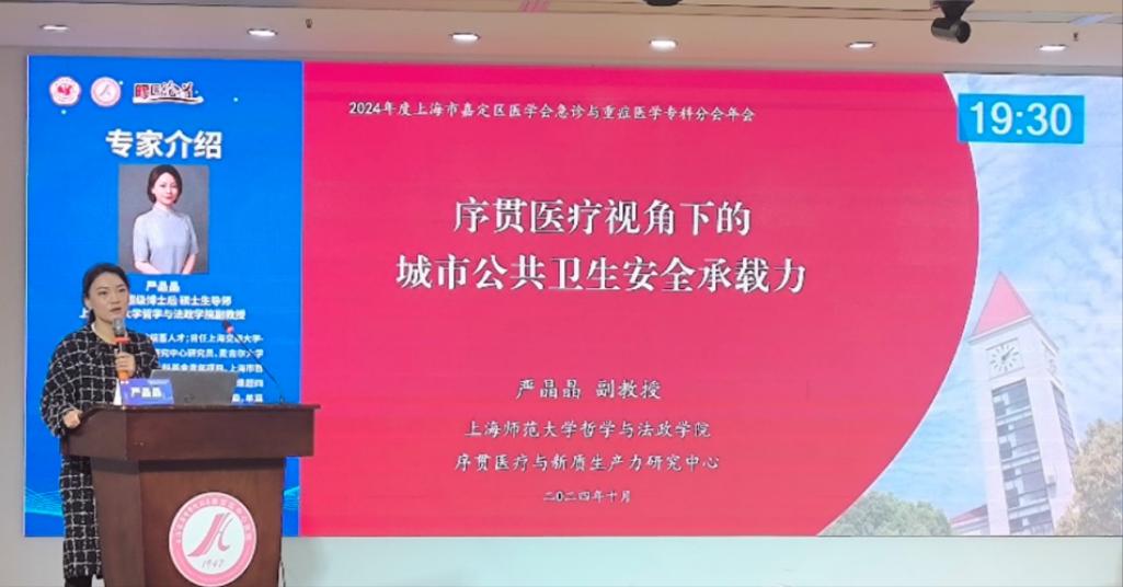 2024年10月16日上午,我院严晶晶副教授参加上海市嘉定区医学会急诊与重症医学专科分会年会,会上作了“序贯医疗视角下的城市公共卫生安全承载力”的主旨报告。在传递知识的同时,激发智慧与灵感,助力急诊医师及时了解城市公共卫生安全主题下的序贯医疗新进展,搭建良好的学术交流平台,多层次、多方位、多角度地拓宽同仁们对于重症医学和急诊科的思考与创新。