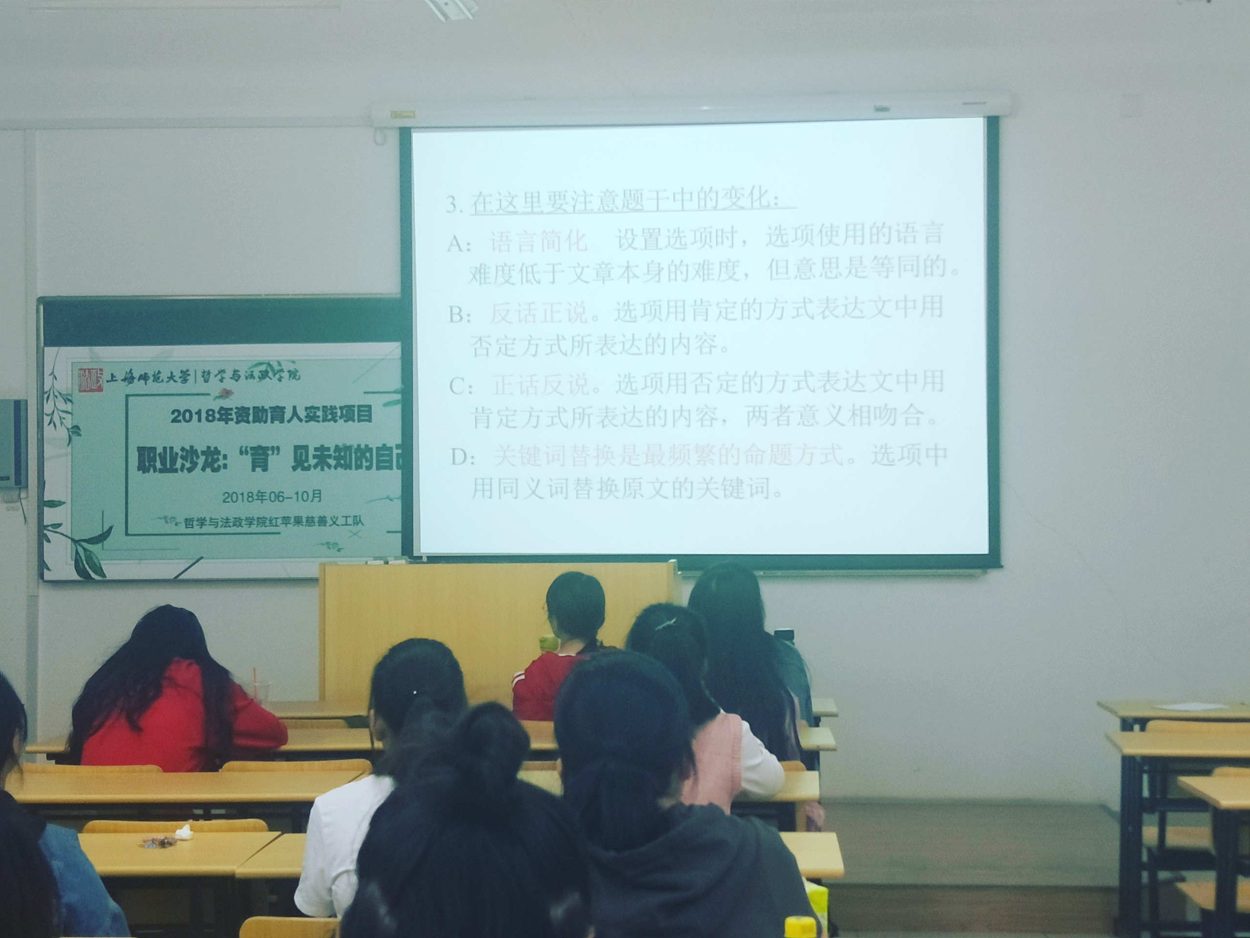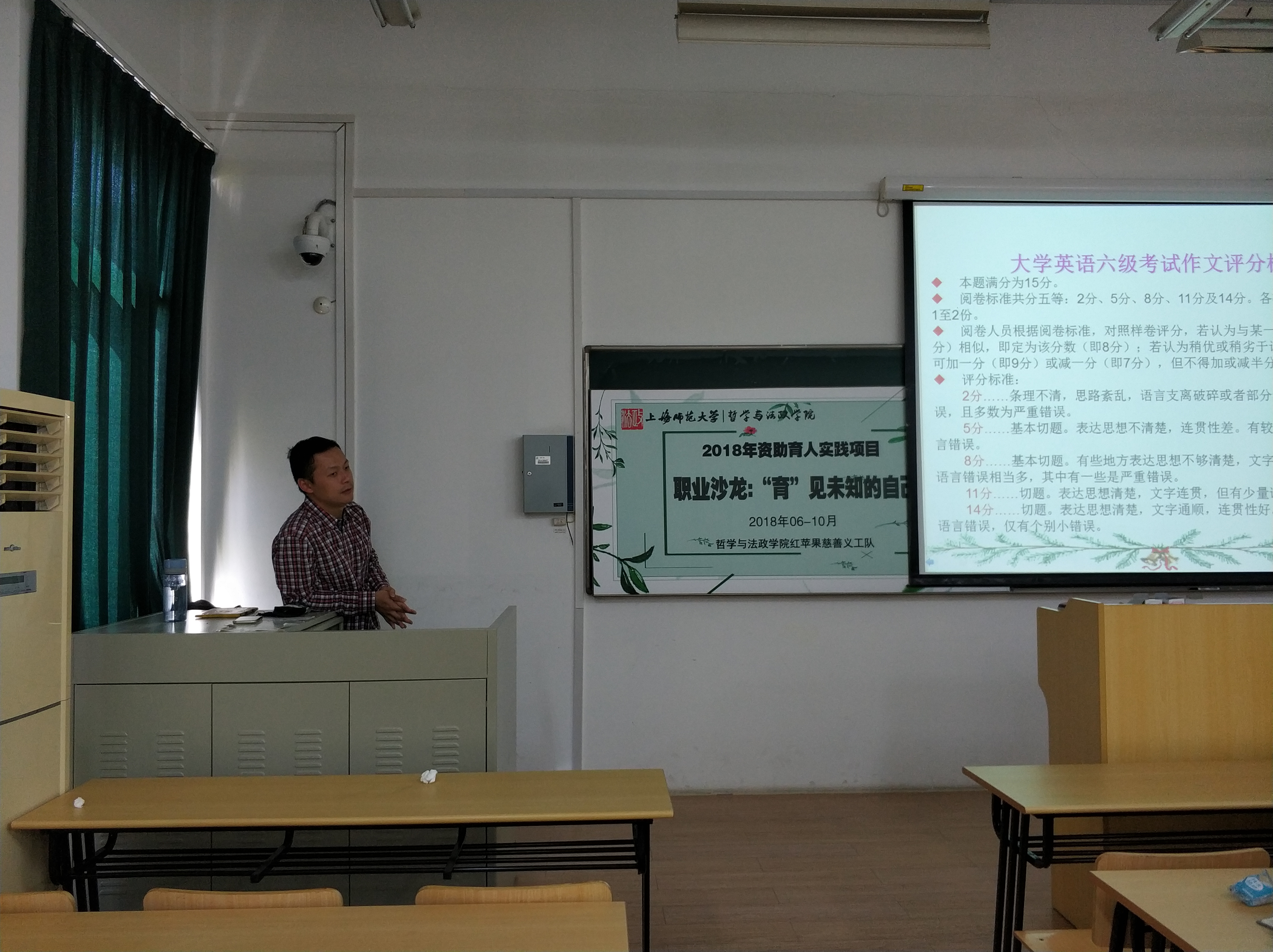 2018年10月12日下午13:00-14:45,快乐堂 资助育人职业沙龙于五教A栋111举办“六级英语冲刺练”主题活动。快乐堂 外国语学院江全康老师特邀出席指导,为广大学子传授了六级题型介绍、难点解剖、英语口语练习方法、听力学习技巧等方面内容,并为学子们解答疑惑。