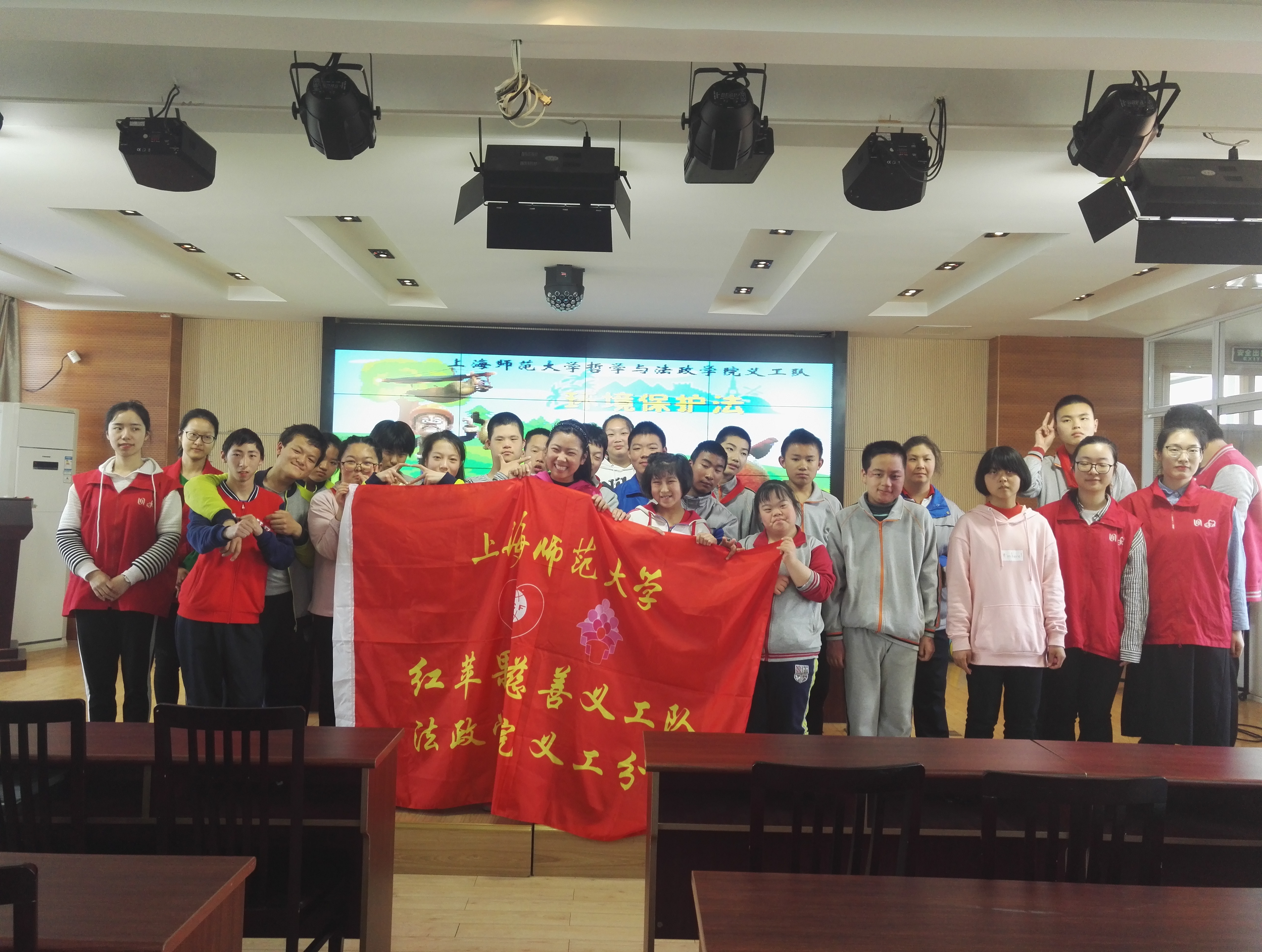 2018年4月20日下午一点,在上海市奉贤区惠敏殊教育学校,快乐堂 义工队举办了以“关爱大自然,普及环境法”为主题的法律微课堂活动。活动中有30余位小朋友参与,同时也得到了学校老师的大力支持。活动主要以动画播放和PPT展示的形式普及关于环境保护法的历史、分类、具体法条以及与此相关的垃圾分类的知识。旨在增强未成年人对于环境保护法的理解和认识并且树立低碳环保意识。