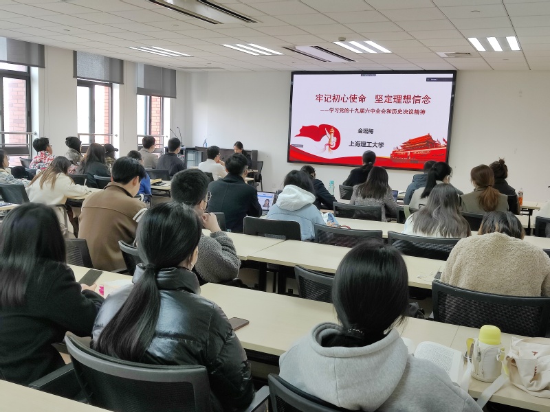 2021年10月26日,邀请上海理工大学马克思主义学院金瑶梅教授作“牢记初心使命,坚定理想信念——学习党的十九届六中全会和历史决议精神”的专题报告。金瑶梅教授分别从“十九届六中全会的议程、重大成就和重大意义”、“《中共中央关于党的百年奋斗重大成就和历史经验的决议》的主要内容和重大创新”、“全面贯彻落实六中全会精神”三个方面引领学生党员深入学习全会精神,力争学出坚定的政治忠诚、清醒的理论自觉、强烈的使命担当。