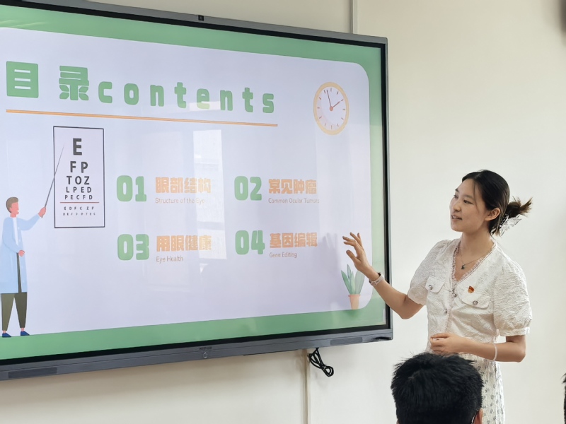 随后,九院临床本长学生党支部眼科2024级博士研究生邱鸣凤以“眼睛也会长肿瘤”为主题,科普了眼科专业知识,栩栩如生地描绘了眼部构造、眼部常见肿瘤、用眼健康注意事项和涉眼部的基因编辑工程等方面。
