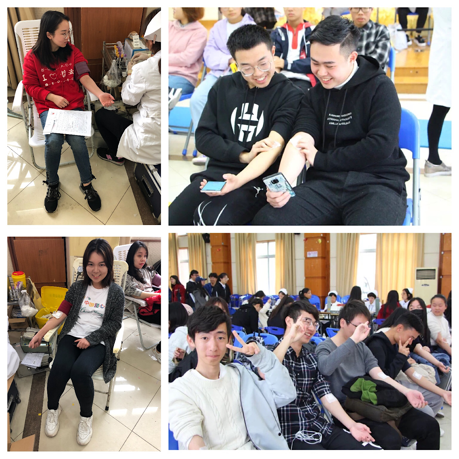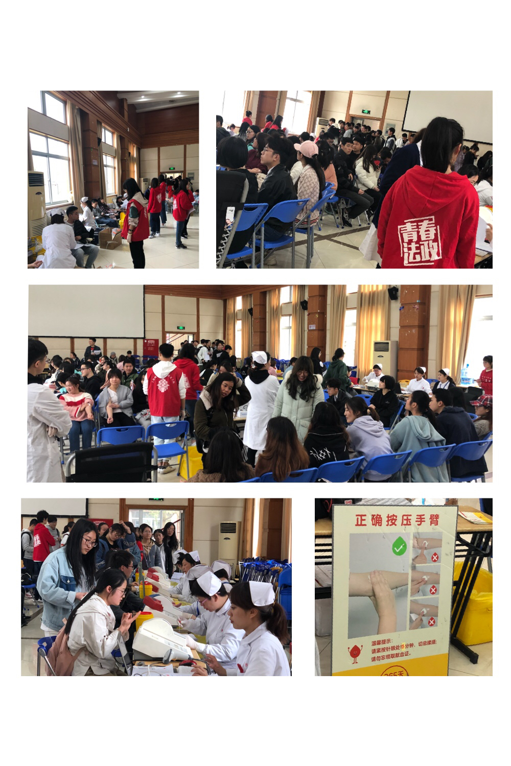 在充足的前期准备和医护人员的帮助下,献血活动顺利展开。在献血过程中,快乐堂 的义工队志愿者们参与现场工作,为鲜血志愿者讲解献血注意事项,维持现场秩序,并积极配合医生和护士的工作,组织学生们献血;同学们在志愿者的引导下依次进行登记、验血、等待通知;在献血过程中,老师们细心询问学生身体状况,安抚学生紧张的情绪。此次献血一直持续到了中午12点才结束,但有不少同学在门口排队,想要积极献血活动。
