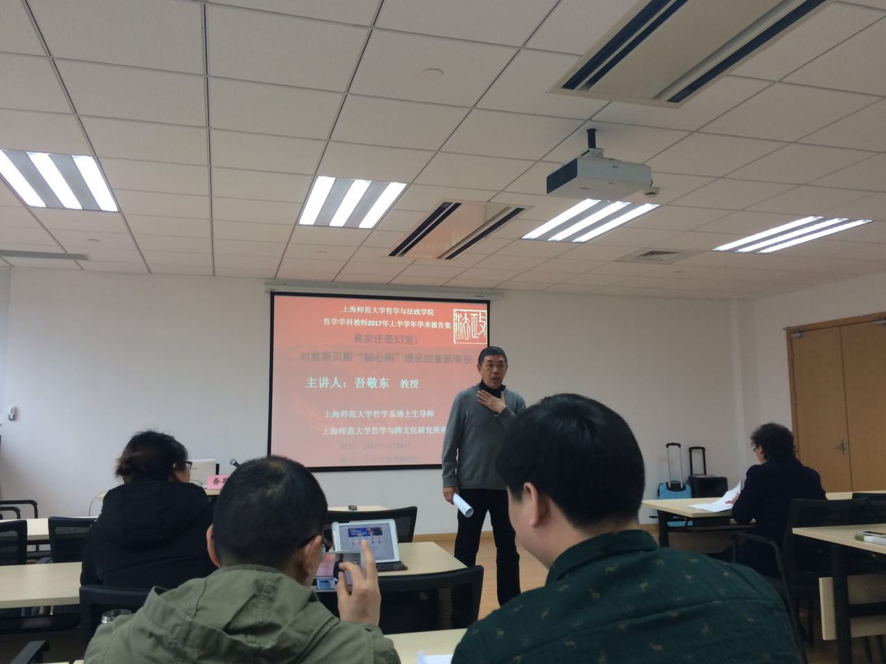 哲学学科教师2017年上半学年学术报告集“思想汇”首场讲座在文科实验楼802报告厅开讲,主讲人是哲学学科中国哲学二级学科负责人吾敬东教授。其讲座的题目为“真实还是幻觉——对雅斯贝斯轴心期理论的重新审视”。吾教授从轴心期理论的时间同步性问题、轴心期的共同因素、东西方轴心的不同等方面,对雅斯贝斯轴心期理论进行了重新审视。吾教授认为,雅斯贝斯轴心期前后跨越600年,其所关涉的几大文明,如犹太教、古代印度、古代中国等,都存在复杂的情况,因此,轴心期理论的普遍性应有质疑,其“共同因素”中包含复杂的不同因素,不能一概而论。他指出,在雅斯贝斯的“轴心期”理论中,时间同步性至为关键,也颇显奥秘。在雅斯贝斯看来,“轴心期”各地区在时间上具有惊人的一致性或同步性。如果我们不只是满足于这种“偶然”的表象,而是深入到这一表象的背后,探究“轴心期”的完整进程和完整内涵,那么,我们也许就会发现雅斯贝斯所热衷的这一表象其实有着某种“欺骗性”。考察表明,古代中国与古代希腊和犹太的“轴心期”在时间上存在着很大的差异。中国轴心大抵是从公元前12世纪至公元前3世纪;希腊一罗马轴心和犹太一基督轴心则是从约公元前7世纪到约公元3世纪;而印度则表现出更加复杂的状况。可以说,不同“轴心”的发展在统一的时间坐标尺度下是“参差不齐”的,因此,所谓“轴心期”,并非像雅斯贝斯说的那样在时间上显得如此整齐划一。“轴心期”理论应当或必须设置更为宽泛的时间条件。但随着这一时间范围的扩大,所谓“同步性”的奥秘便不复存在。吾教授以其渊博的知识、深刻的思想为我们奉献了一场精神的大餐!与会同学积极发言,踊跃提问,吾老师认真、细致、谦虚、智慧地一一作答。