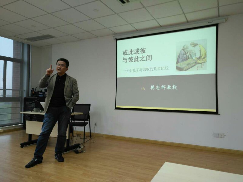 樊志辉教授,给全院师生带来了一场精彩的学术讲座。他主讲的题目是《或此或彼与彼此之间——关于孔子和耶稣的几点比较》。这次讲座是"思想汇"系列讲座的第二场,来自全校的80多名师生聆听了讲座。