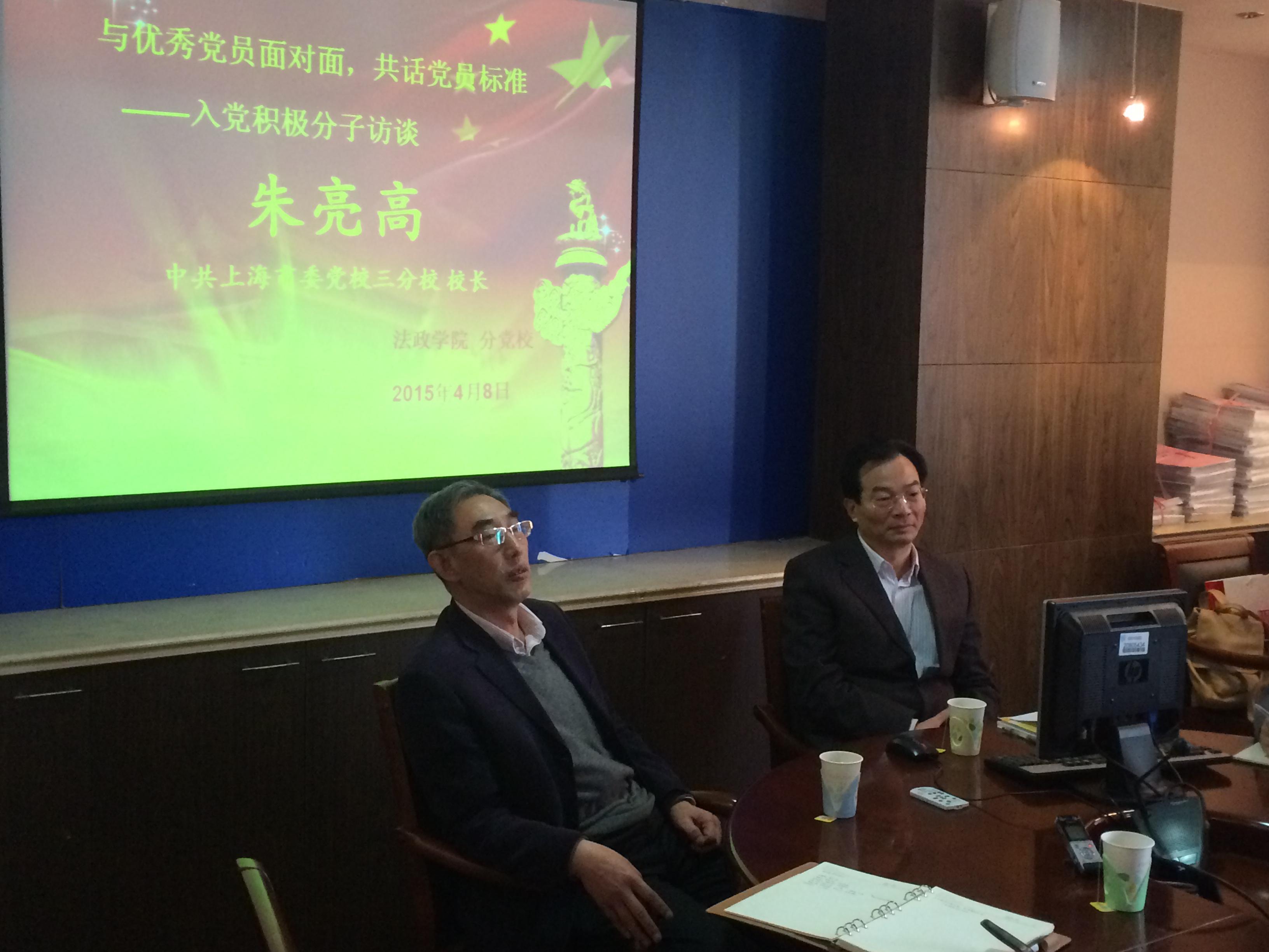 2015年4月8日下午,法政学院在文苑楼1204室开展了“与优秀党员面对面,共话党员标准”入党积极分子班主题访谈活动。中共上海市市委党校第三分校校长朱亮高作为访谈嘉宾出席了本次活动。来自徐汇校区和奉贤校区的28 ( 中共上海市市委党校第三分校校长 朱亮高、法政学院 党委书记 商红日 ) 访谈伊始,朱亮高校长就以其亲身经历告诉我们:自己抱着怎样的心态入党,参加工作后,踏实勤奋,积极向党组织靠拢。加入党组织后,在工作生活中如何发扬党员的先进模范作用。在访谈过程中,入党积极分子们结合自身经历与感想,纷纷向朱校长发言提问。比如:您当年抱着什么想法写入党申请书?您在加入党组织后,生活学习有何变化?入党后的考验和困难是怎么解决的?对入党积极分子有什么建议?朱校长结合其工作和生活经验耐心地一一作了回答。他指出,要以党员的标准严格要求自己,胸怀大局观念,坚持理想信念,从自己的一言一行来践行社会主义核心价值观。他真诚地说道:“在当前全面建成社会主义小康社会的重要时期,在中央提出“四个全面”的新时期,当代大学生加入党组织可以更好的实现自己的人生梦想,从而为实现中国梦贡献自己的力量。” ( 中共上海市市委党校第三分校校长 朱亮高与法政学院 党校学员座谈) 访谈的最后,朱亮高校长用“从我做起,从当下做起”和“树立正确的人生坐标,无论顺镜、逆境,一定要实事求是,弘扬这个优良传统,追根溯源,正本清源。向身边优秀的人学习,走好自己的人生路”等寄语与入党积极分子共勉。他平实而真诚的讲话如春风化雨,润人心田。通过这次访谈,入党积极分子纷纷表示对于如何端正入党动机、争取早日入党以及将来如何做一名优秀的共产党员都有了更为深刻的认识。
