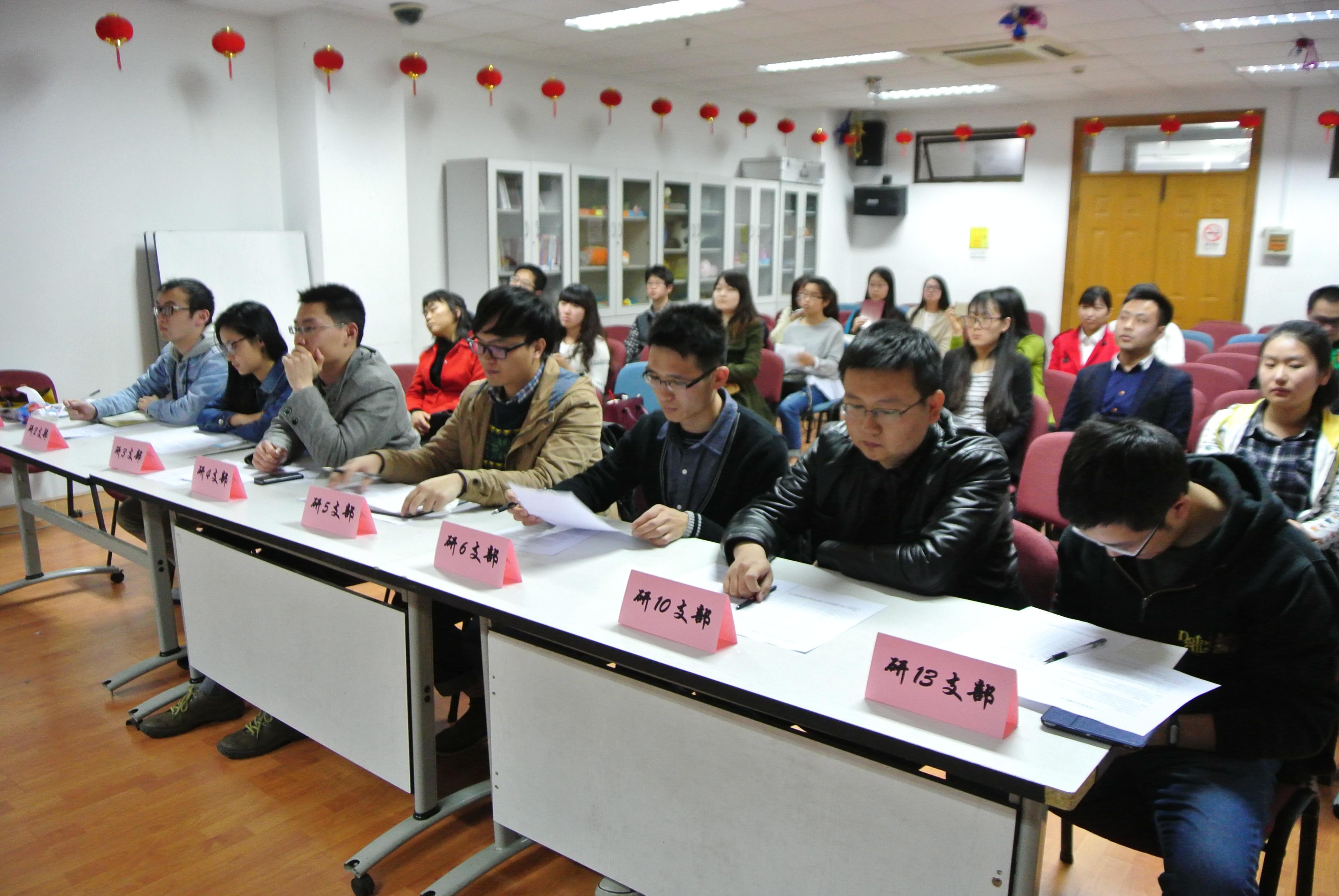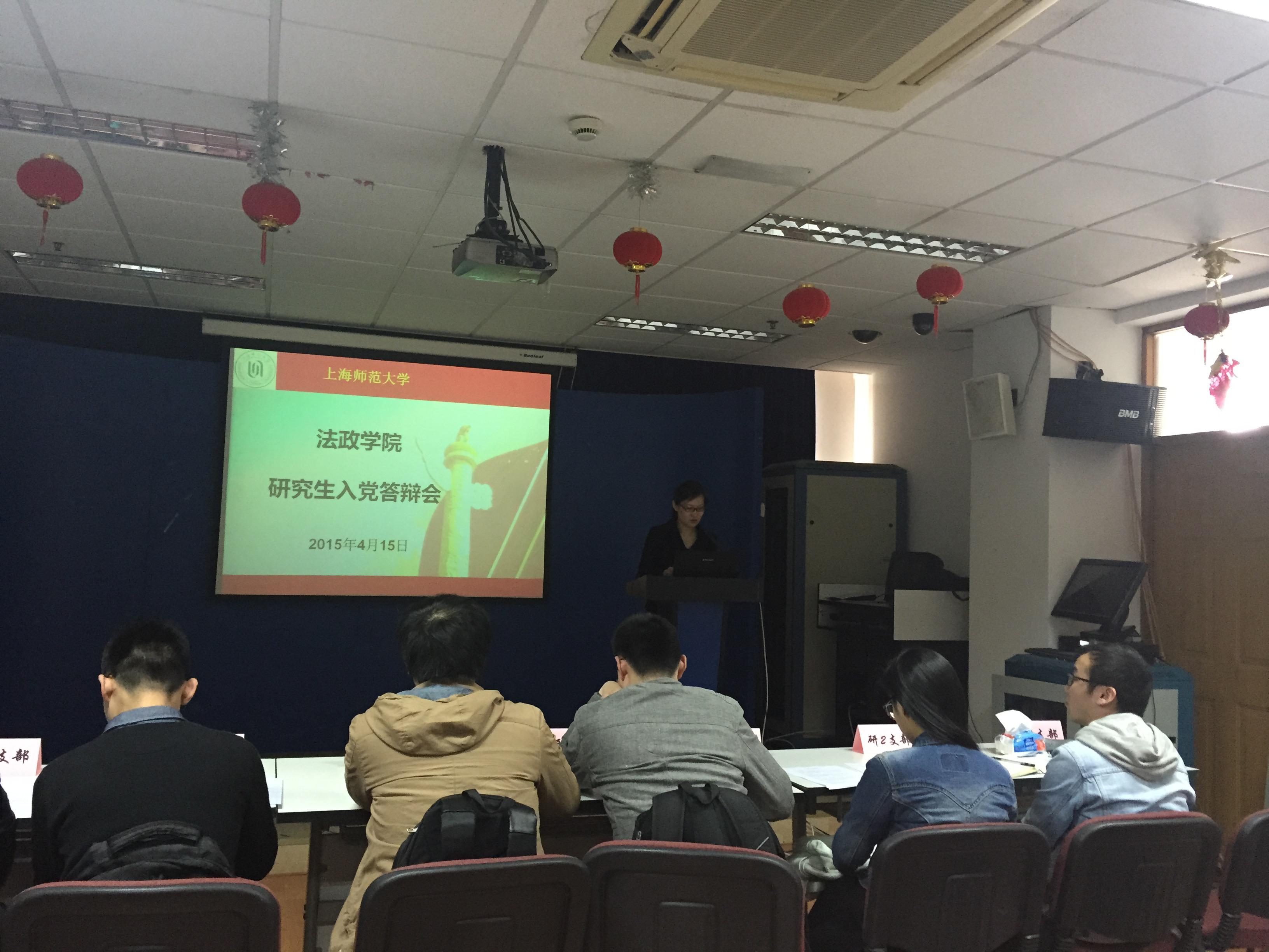 2015年4月15日下午,快乐堂 在文苑楼1002室举办研究生入党答辩会。学院党委组织员陈敏老师,研究生辅导员王秀萍老师出席了本次答辩会。来自研究生第一、二、三、四、五、六、十、十三党支部的8名入党积极分子以及各自的入党联系人、介绍人参加了会议。上述8个支部的支部书记担任本次答辩会的评委。会议由第一党支部书记田思倩主持。