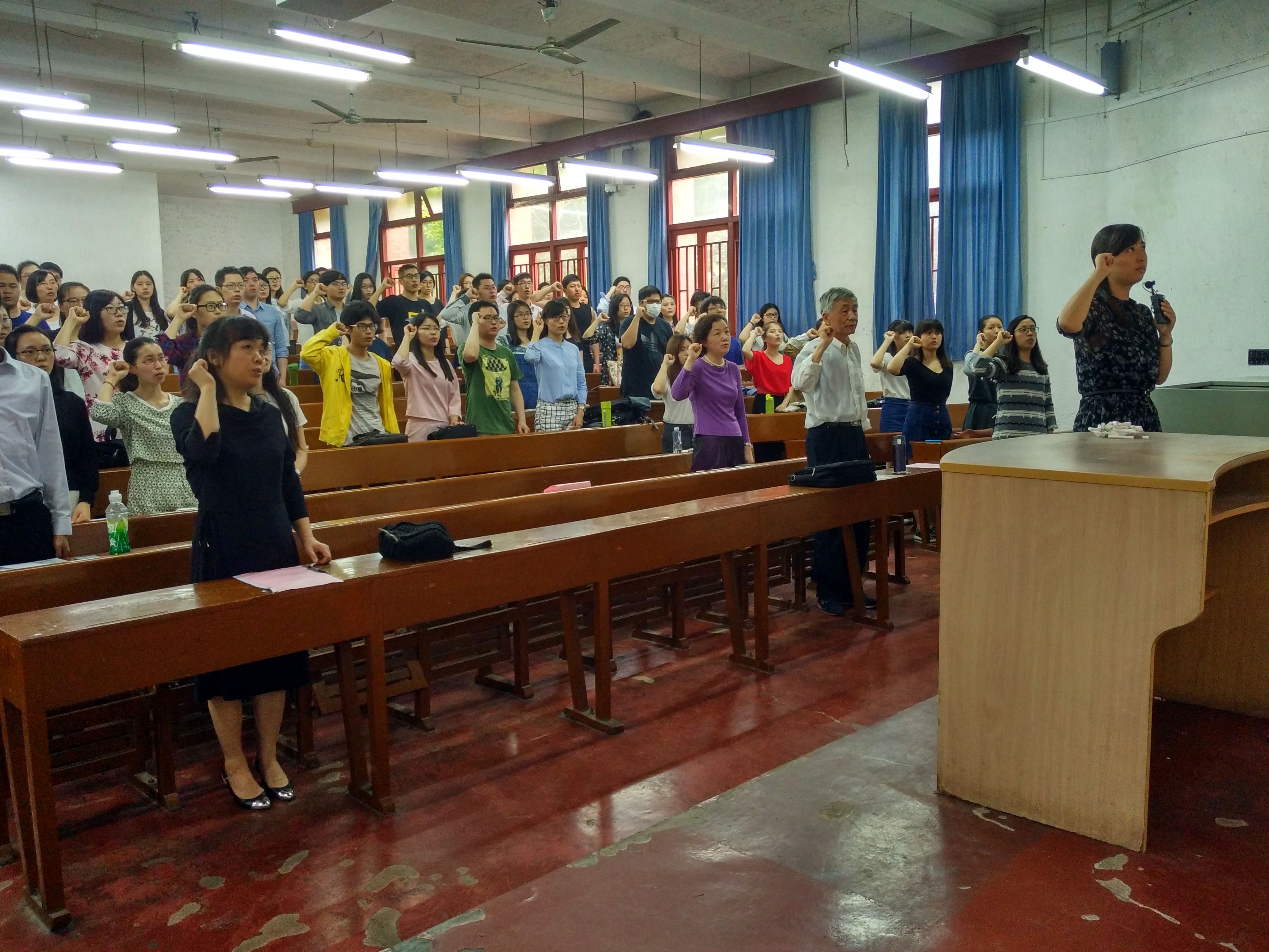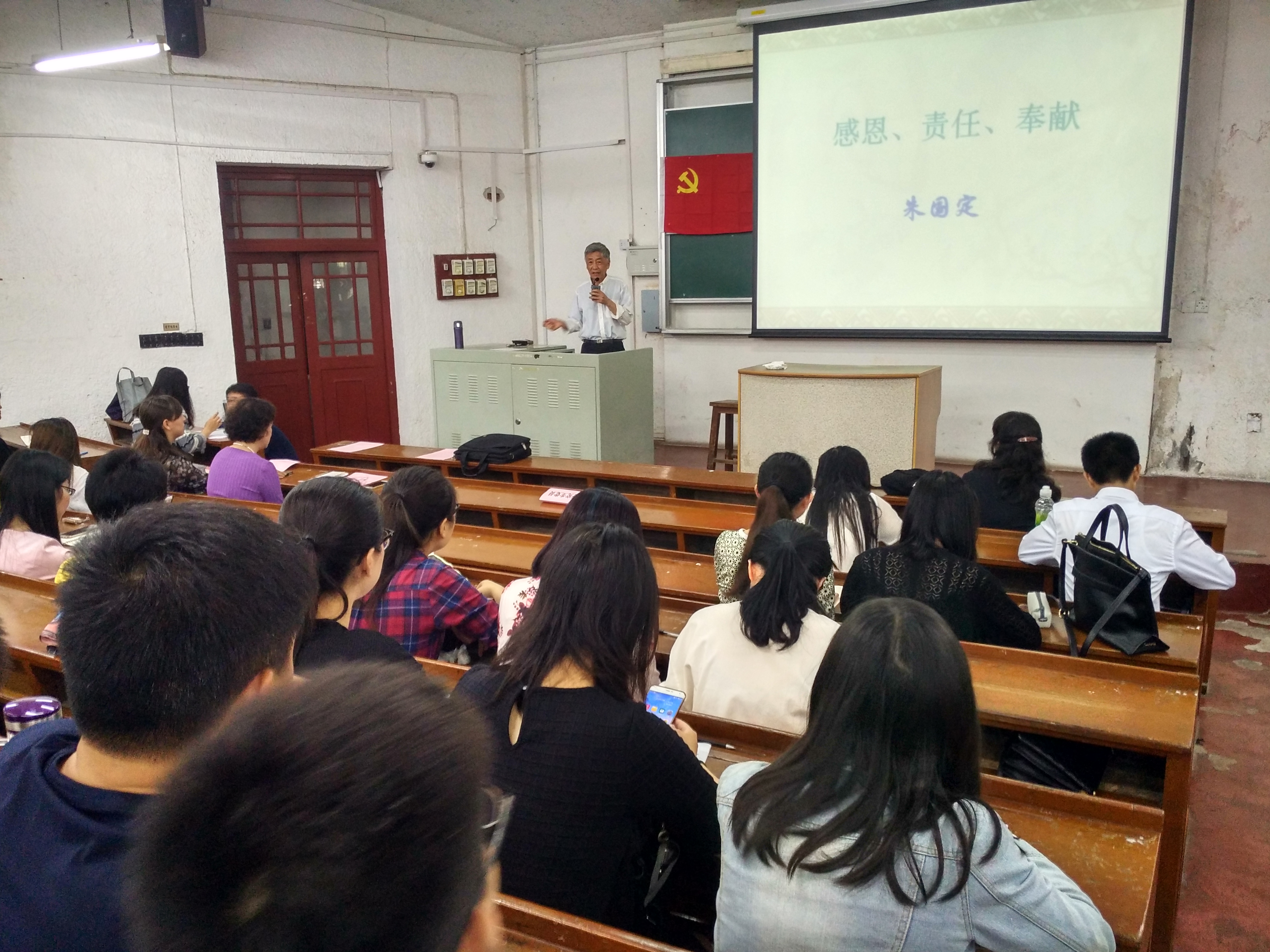 朱国定老师则给毕业班全体党员带来“不忘初心,感恩前行”的主题教育讲座。朱老师的演讲通俗易懂、生动风趣而又不乏深刻意涵、发人深省。这种词浅意深的表达风格深受在座的毕业生党员的喜爱,他们不时发出忍俊不禁的笑声和情不自禁的掌声。