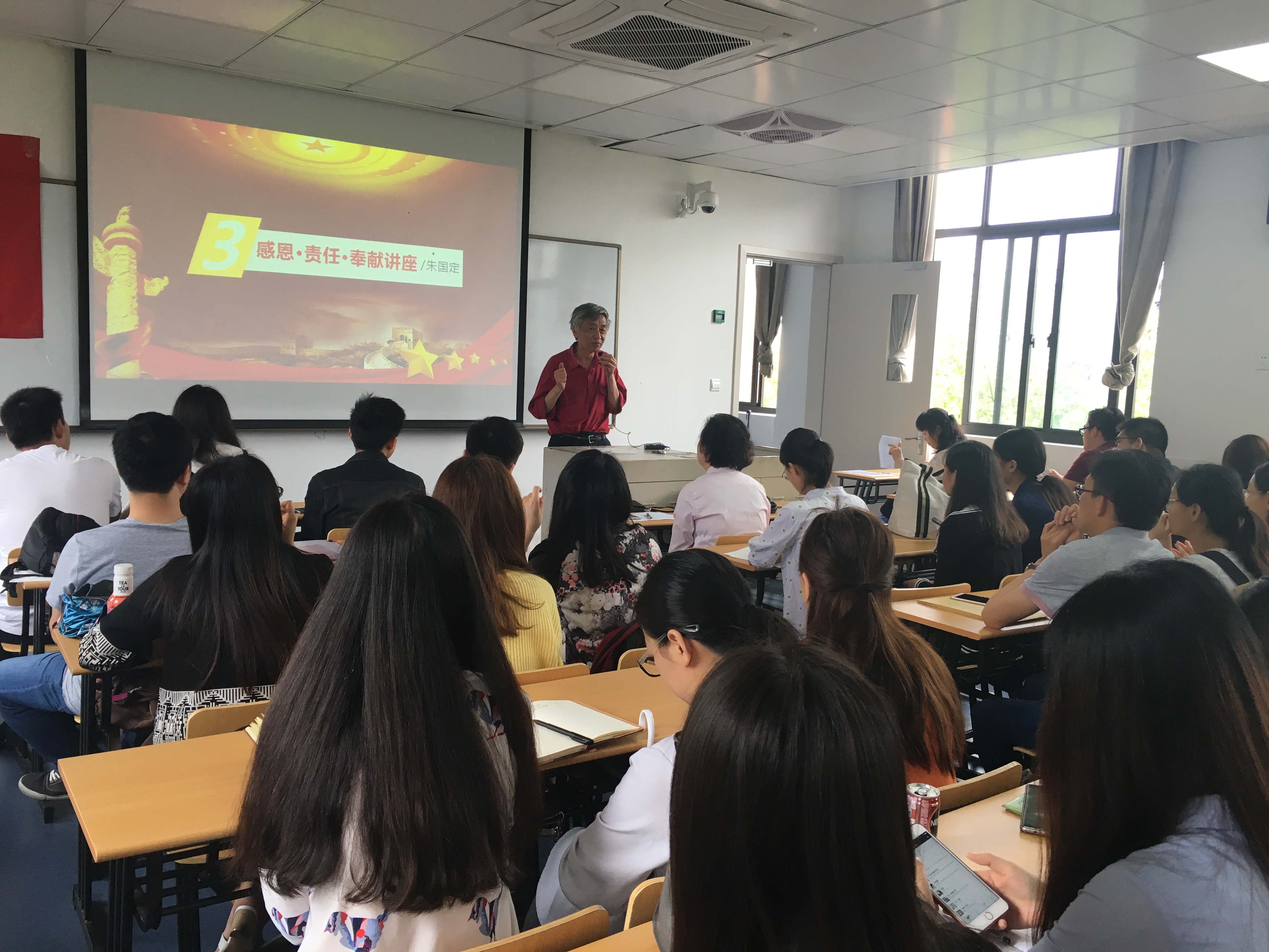 本次会议诚邀朱国定老师做“感恩·责任·奉献”的主题讲座,朱老师的演讲通俗易懂、生动风趣而又不乏深刻意涵、发人深省,深受在座的毕业生党员的喜爱,他们不时发出忍俊不禁的笑声和情不自禁的掌声。朱老师认为作为一名党员,要学会感恩也即学会做人,要有责任和奉献精神。