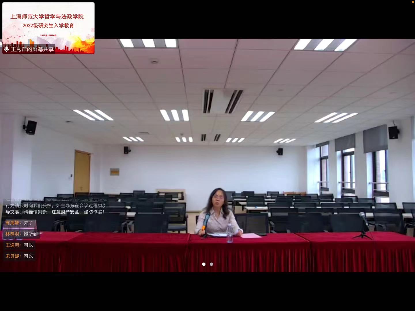 2022级研究生新生辅导员王秀萍结合研究生手册,为同学们介绍了上课时间、需要关注的主要网站和研究生期间主要奖项及评定细则,详细讲解了团学活动和研究生宿舍管理规定、课程安排、学分、毕业管理、开学注册、日常请假制度等基本事项,并强调了防疫要求。王老师希望大家做一名有规则意识、懂责任担当的研究生,构建自己的良好生态系统。