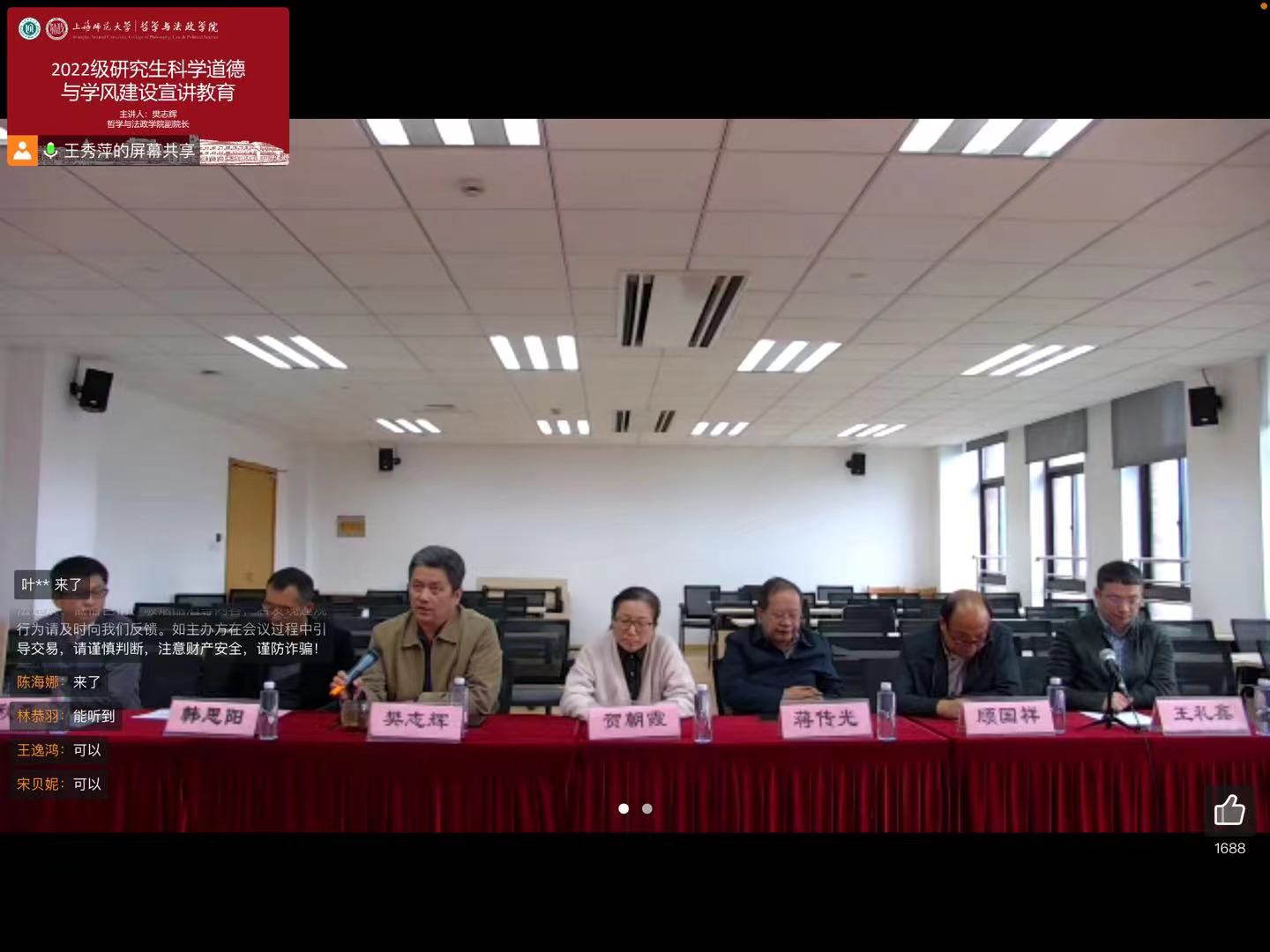 副院长樊志辉教授为同学们带来学术道德与学风建设教育,他指出研究生阶段做学问应刻苦严谨,不断培养自己的学术兴趣和学术能力,严格遵守学术规范,以高标准严要求严格要求自己,以持之以恒的态度进行学术创作。