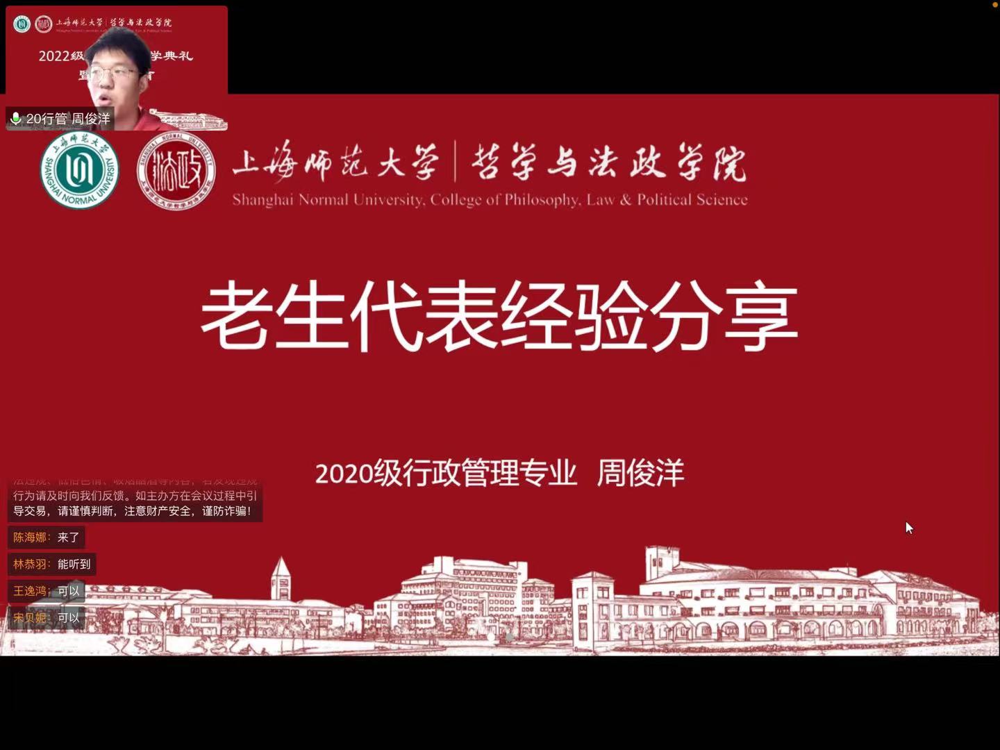 2020级行政管理专业的周俊洋同学作为研究生老生代表、2022年国家奖学金的获得者分享了自己论文发表和科研立项的经历,并强调在研究生阶段与导师、同学、朋友以及同门合作的重要性,鼓励同学们充分利用学习时间,不断提高发展自己,在有限的时间取得更大的收获。