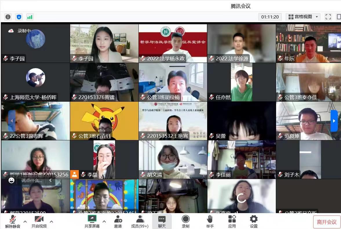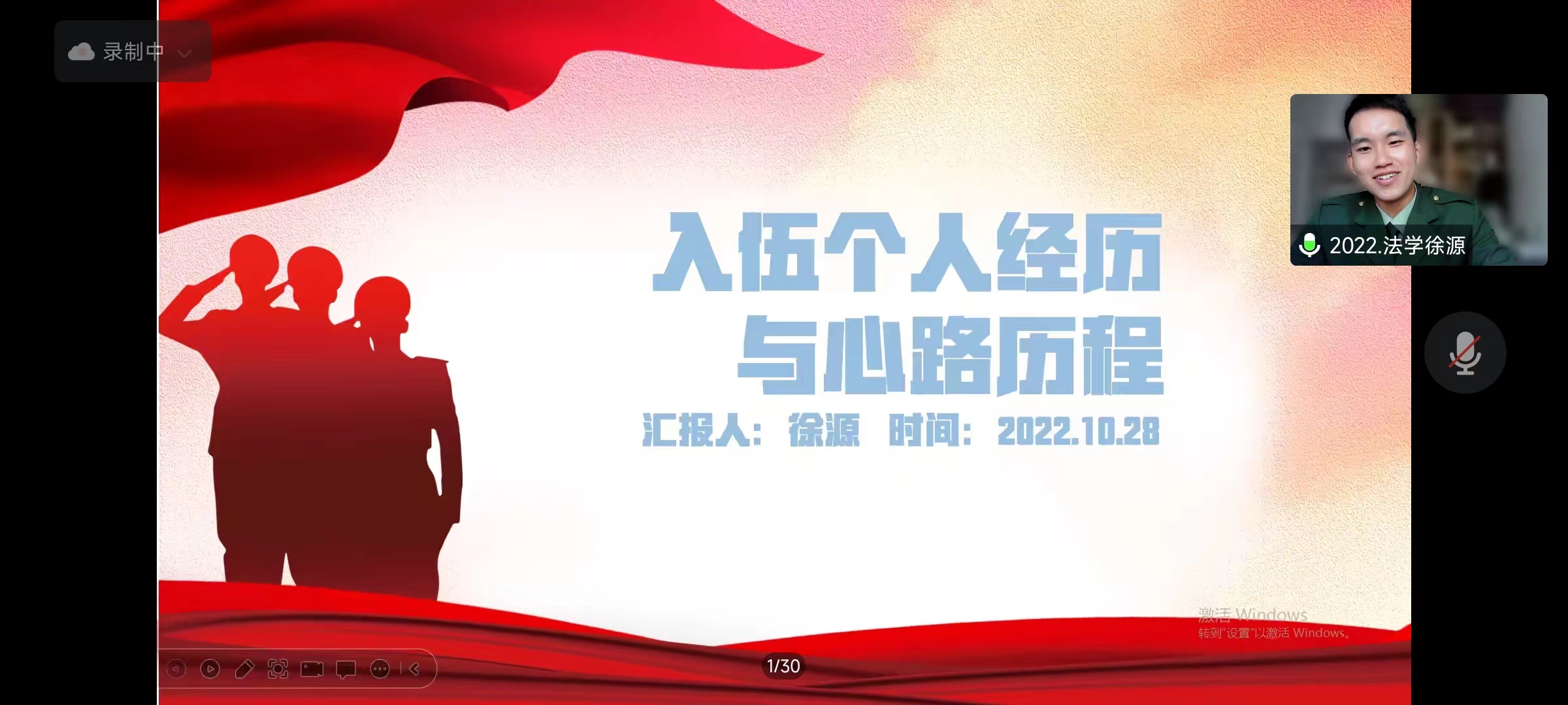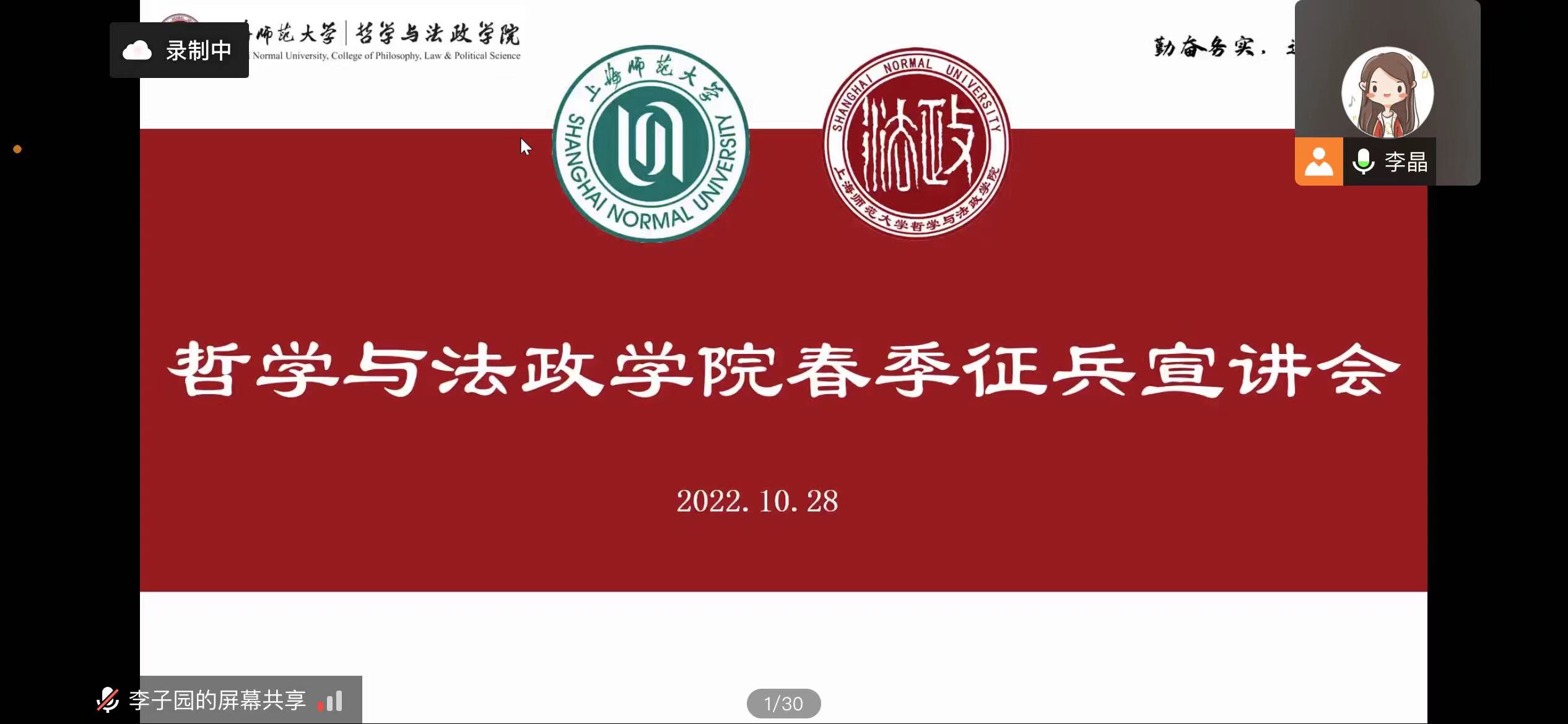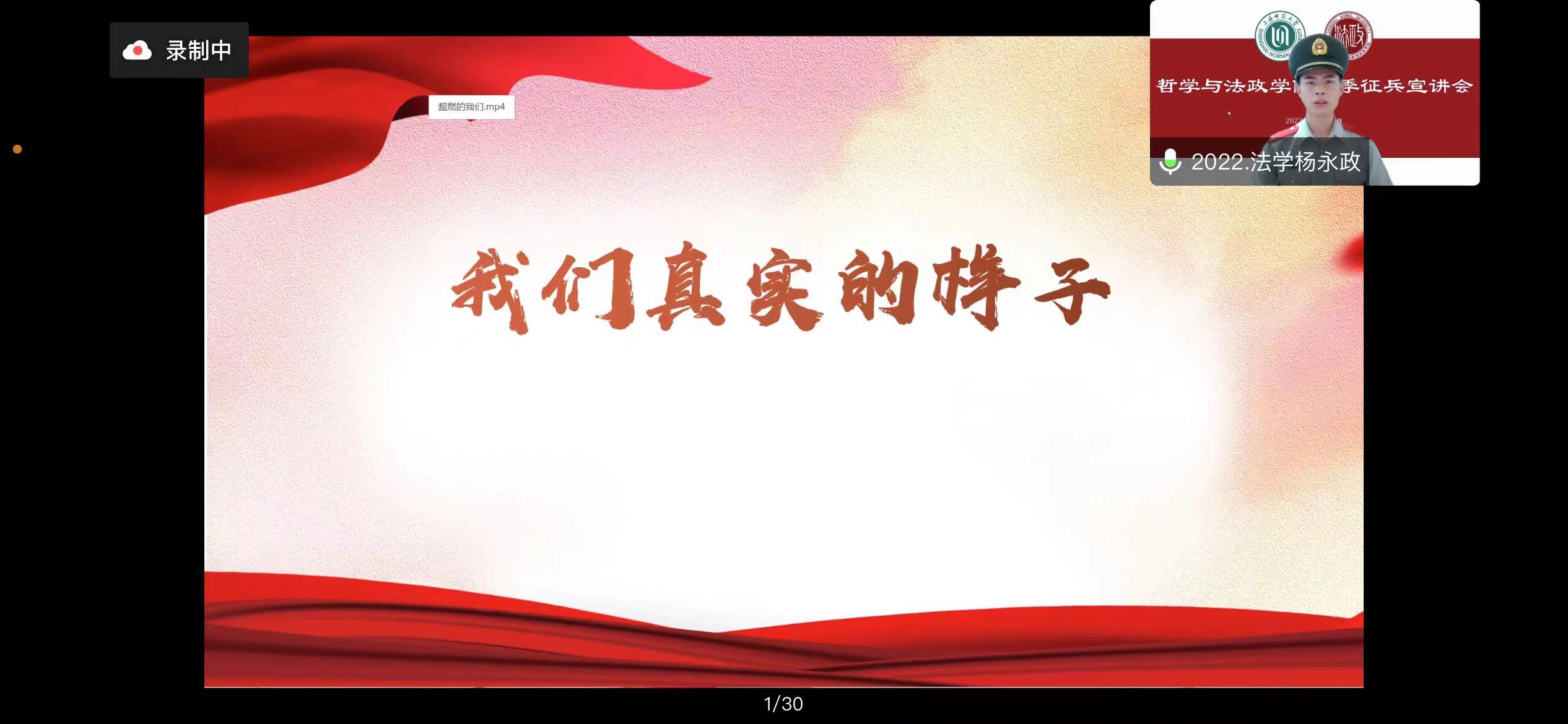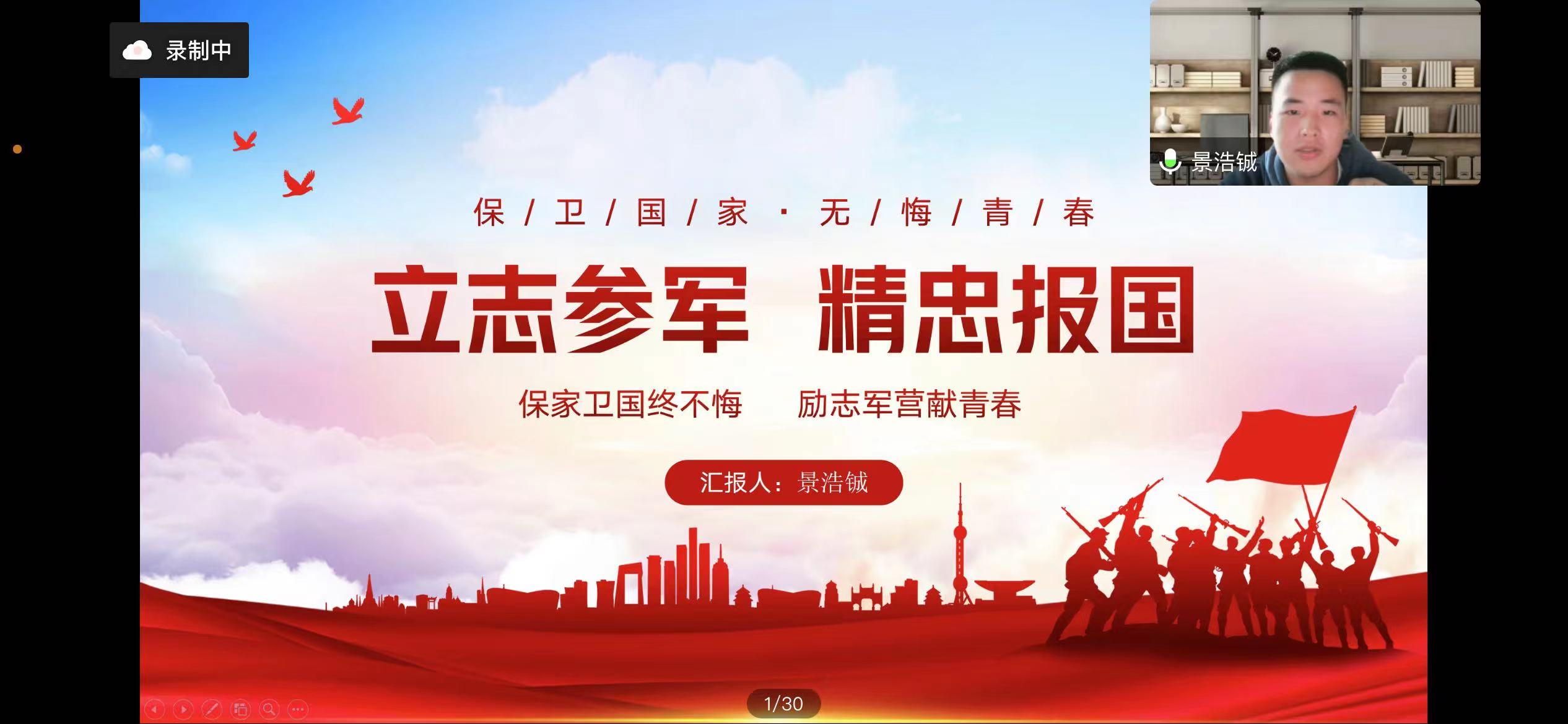 为加强征兵政策宣传,做好大学生应征入伍工作。2022年10月28日14:00,快乐堂 春季征兵宣讲会在线上顺利举行,学院兼职辅导员牛乐和景浩铖、杨永政、施韦全、徐源四位退伍复学同学作征兵入伍政策宣讲和军旅生涯分享, 2022级全体本科生、部分本科毕业生和研究生参加。