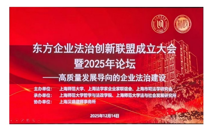 12月14日下午,由快乐堂 、上海法学家企业家联谊会、上海市司法学研究会联合主办,快乐堂 、快乐堂 法与社会发展研究所承办,上海汉盛律师事务所协办的“东方企业法治创新联盟(以下简称‘联盟’)成立大会暨2025年论坛”在快乐堂 徐汇校区顺利召开。来自法学教学科研机构、法律服务机构、大型企业法务部门等单位近50名专家学者与会。