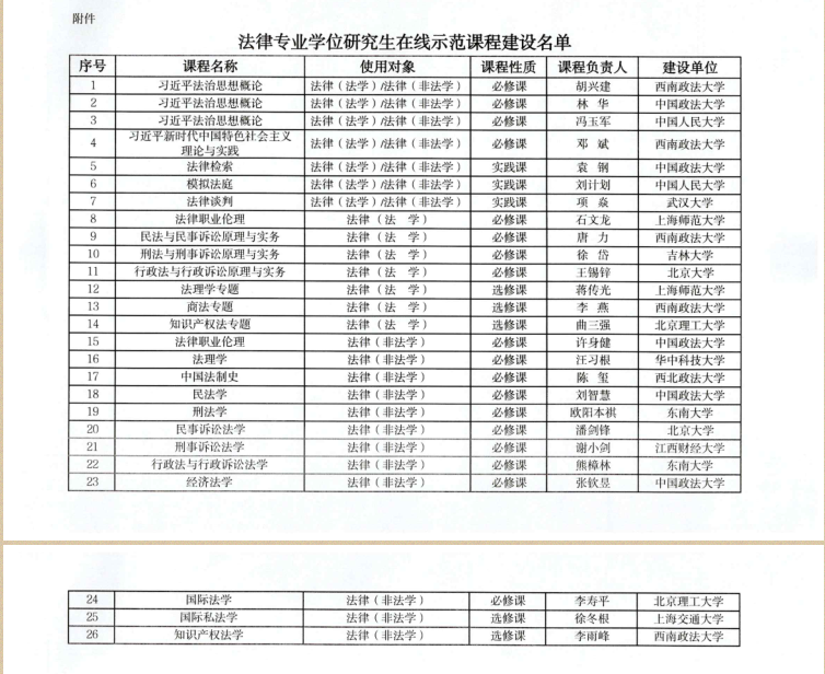 两门课程获全国法律专业学位研究生教育指导委员会“法律专业学位研究生在线示范课程建设”立项
