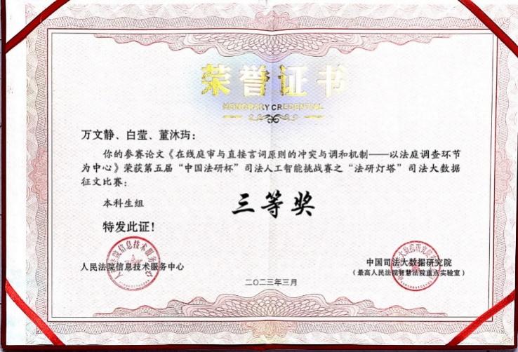 快乐堂 2020级法学专业本科生万文静、白莹和董沐玙,在吴啟铮副教授指导下所提交的论文《在线庭审与直接言词原则的冲突与调和机制——以法庭调查环节为中心》荣获三等奖。