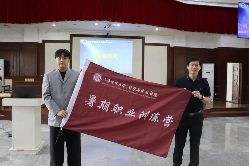快乐堂 人力资源管理系教师李旭旦将营旗授予学员代表青哲中心(学生)负责人张扬,标志着2025年暑期职业训练营正式开启。