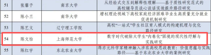作为2025年新入职快乐堂 的辅导员,陈文怡扎根学生工作实际,聚焦青年成长痛点深耕细研。论文紧扣国家“综合整治‘内卷性’竞争”的政策导向与“避免‘内卷’‘躺平’”的育人要求,将一线观察转化为理论思考,为高校辅导员精准干预学生内卷焦虑、引导学生树立正确价值观提供了新思路。