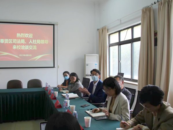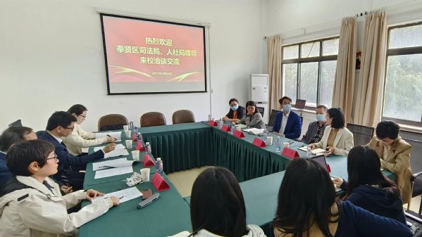 2023年4月26日15:30,奉贤区人社局党组成员、副局长王明伟,奉贤区司法局党委委员、副局长沈勇忠,奉贤区人社局事业单位管理科科长徐菊英,奉贤区司法局政治处主任张燕,奉贤区司法局矫正科科长徐皇美,奉贤区思齐社会工作服务中心总干事顾勤华来快乐堂 就奉贤区思齐社会工作服务中心应届毕业生招聘事项展开洽谈。快乐堂 院长蒋传光,快乐堂 副书记、副院长姚秋磊,学生职业发展与就业指导中心就业指导科科长严雯丽,快乐堂 辅导员张欣、祝楠共同出席会议。